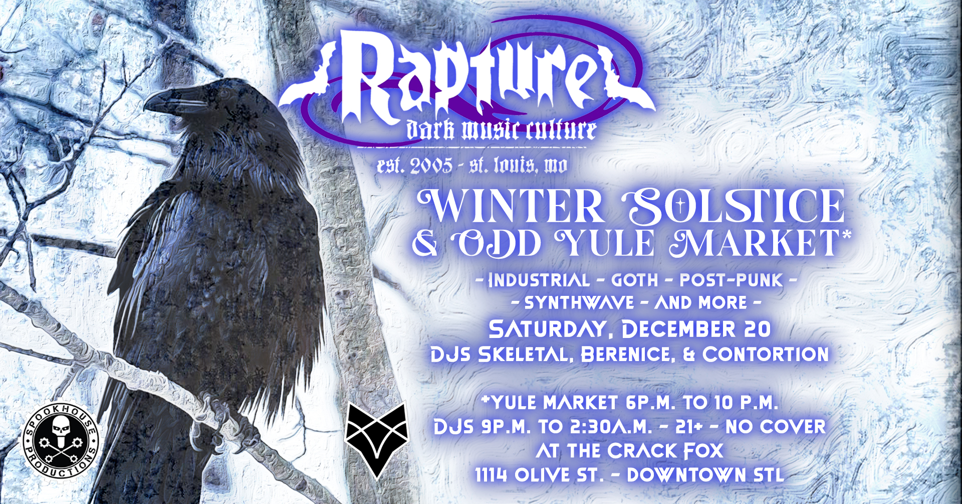 For more up-to-date information, please follow our Facebook page (facebook.com/rapturestlouis). We also have past podcasts up at www.mixcloud.com/rapturestlouis, and occasional livestreams via Twitch.